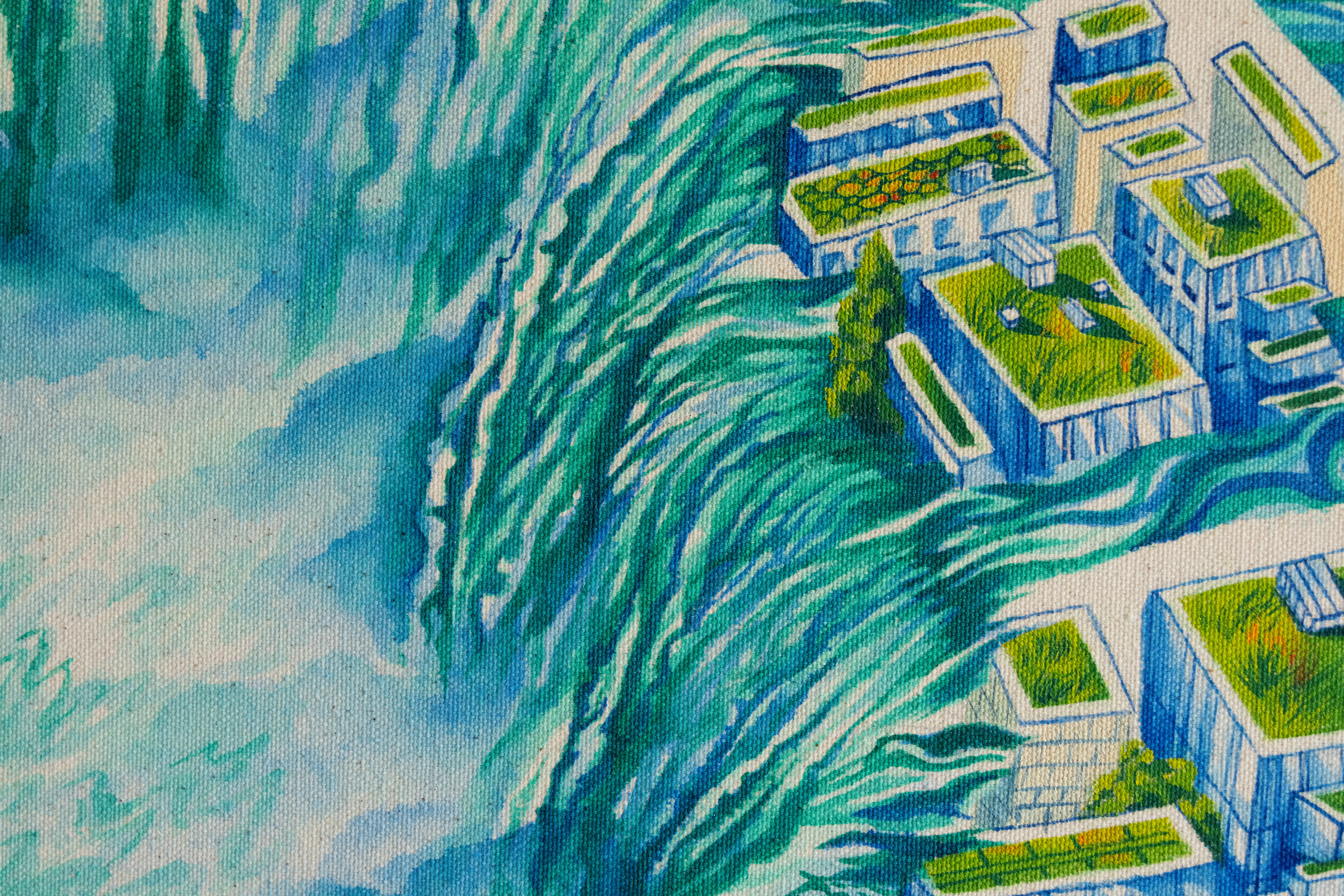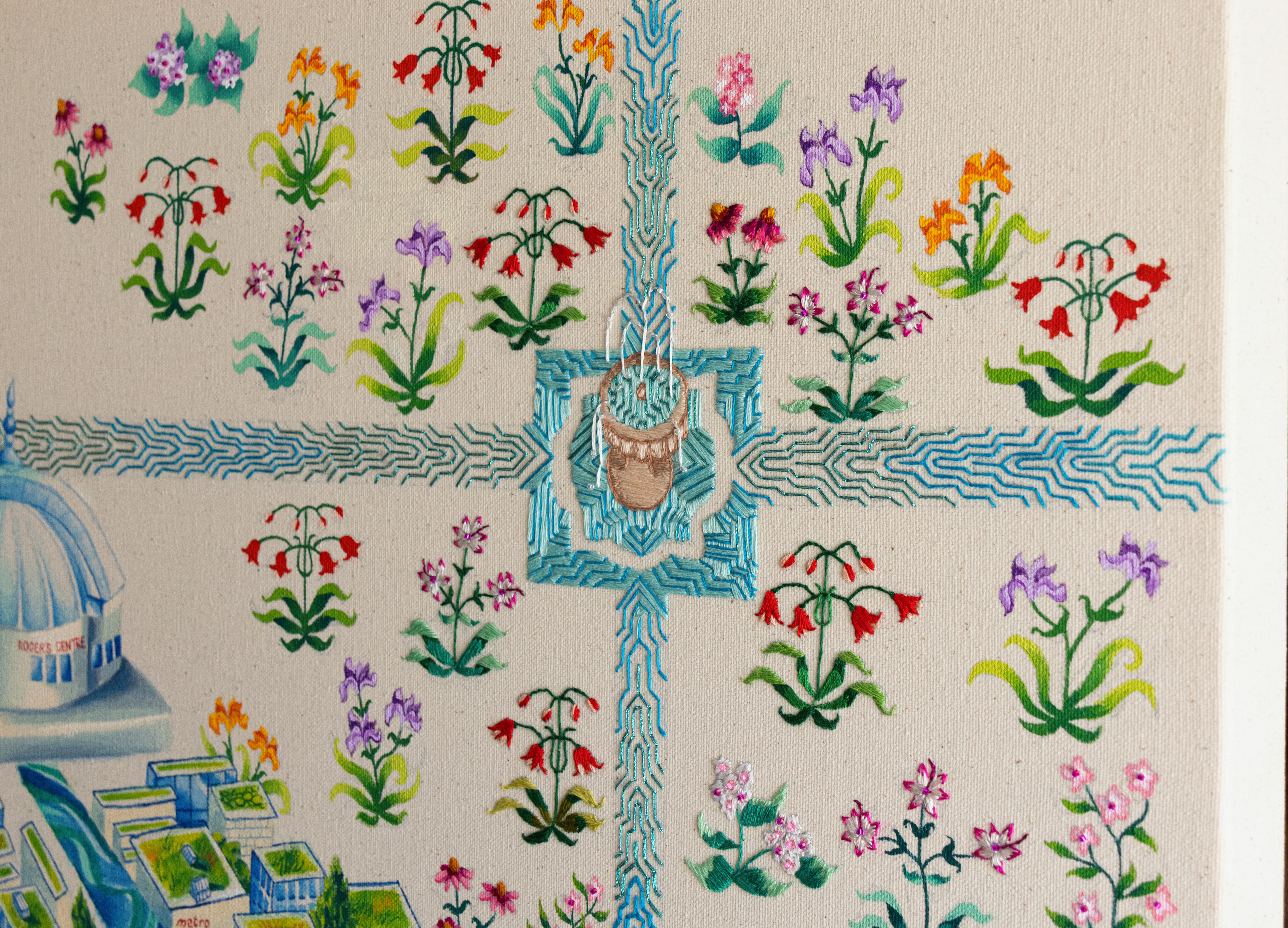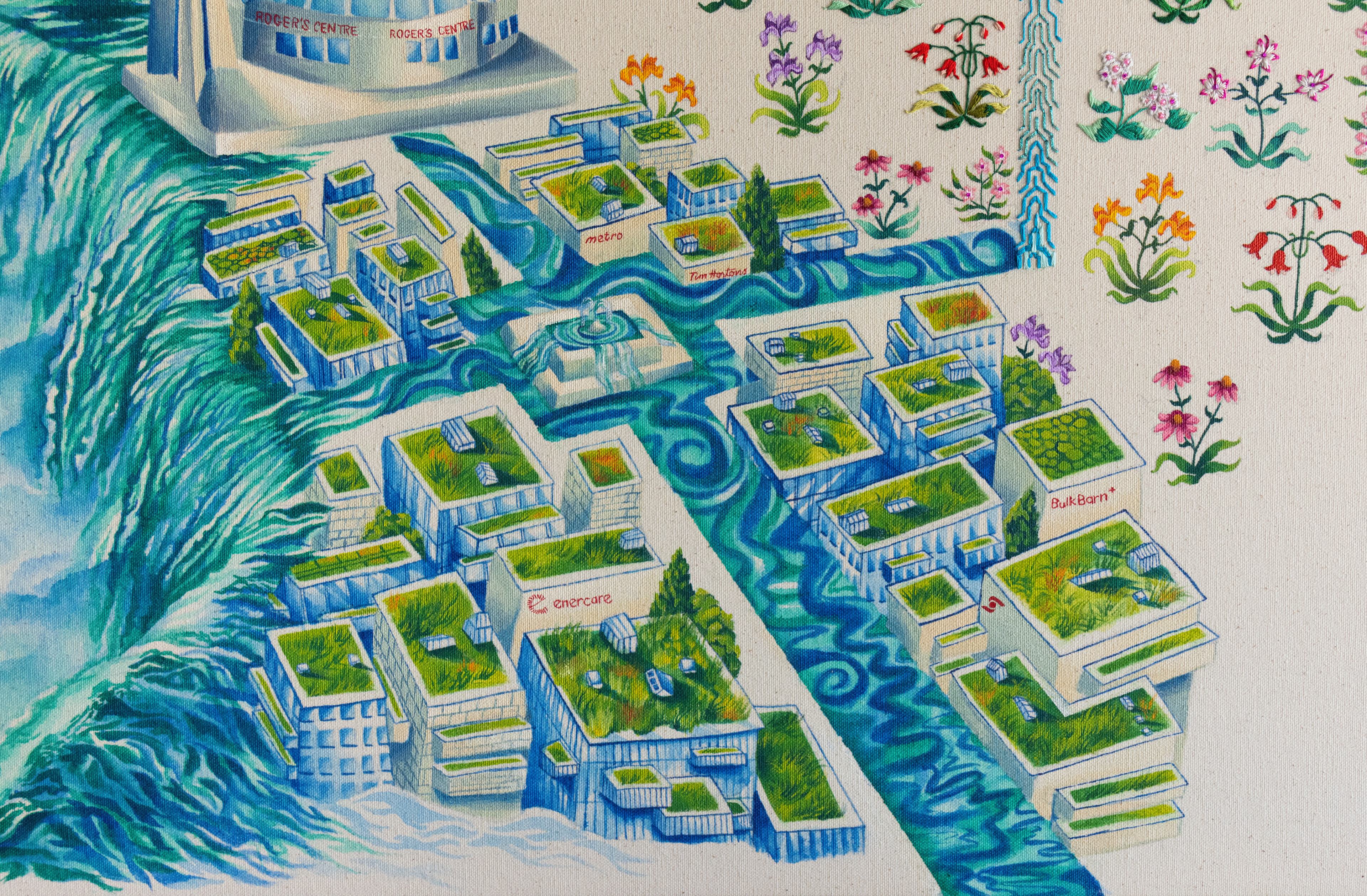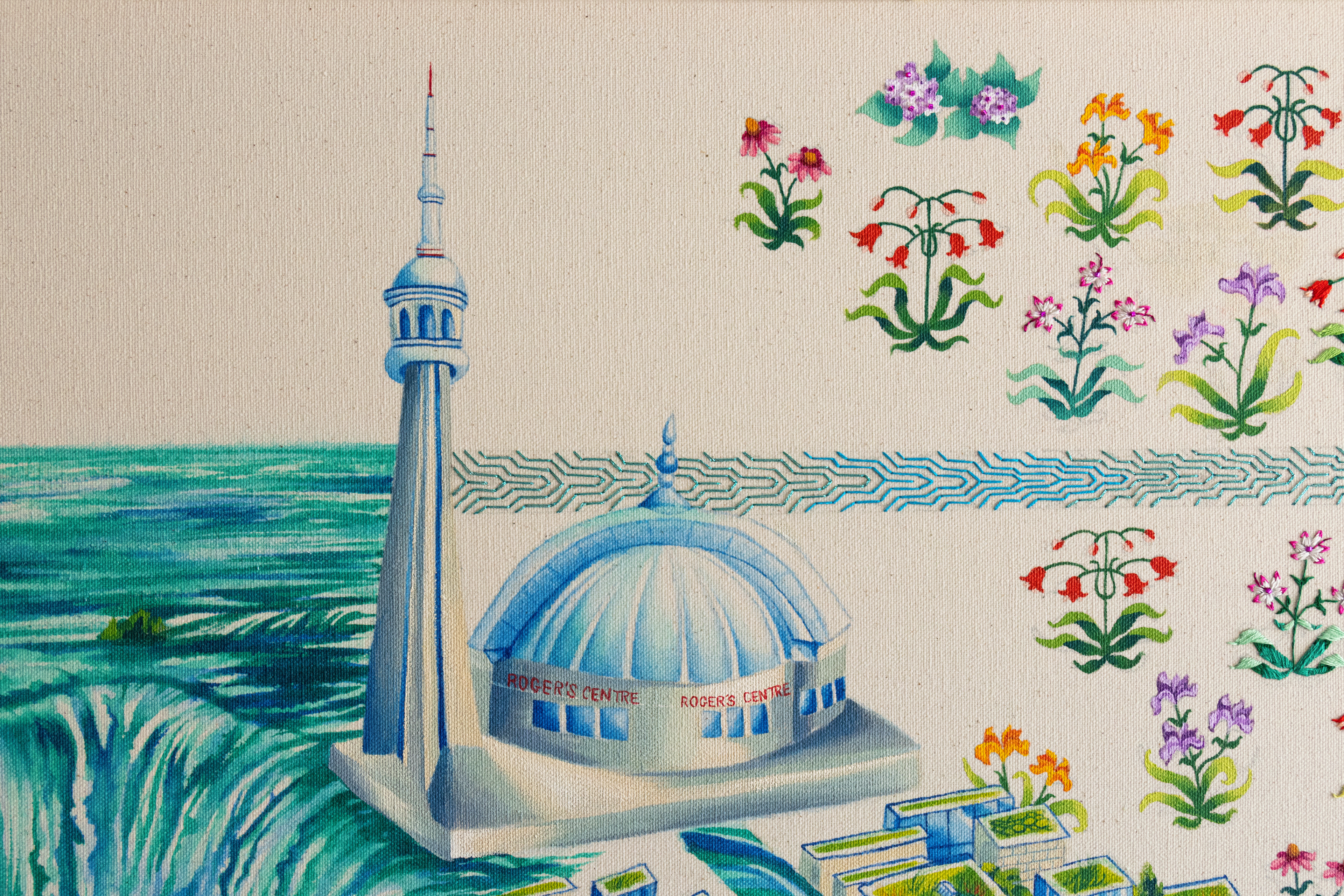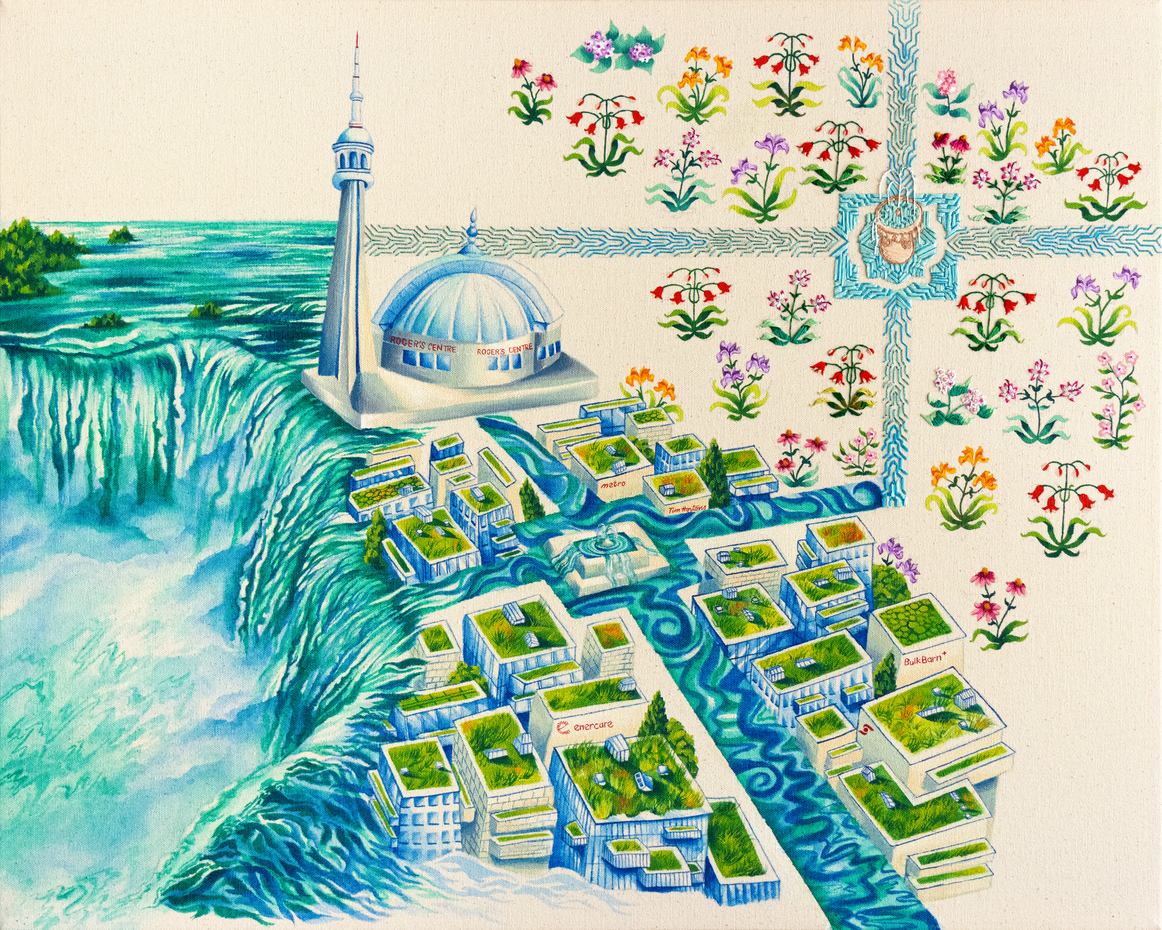 The CN Tower and Rogers Centre are reimagined as the Taj Mahal with chhatri cupolas, and are perched on Niagara Falls just as the Taj overlooks the Yamuna River. The interplay of cultural symbols, the CN Tower, a symbol of Canadian nationalism, and the Taj Mahal, signifying imperial Mughal power, questions how cultural empires shape the land they govern. While Canada's colonial and neoliberal history has industrially paved Toronto with towering skyscrapers and commodified Niagara Falls, which is significant to Indigenous people, Mughal and other Islamic empires are notable for the water, architectural and garden innovations they brought with them that became sites for cultural intersections. The painting asks: What if the Mughals had brought the four-part garden tradition and its associated cultural solidarities to Canada as they had done in India?