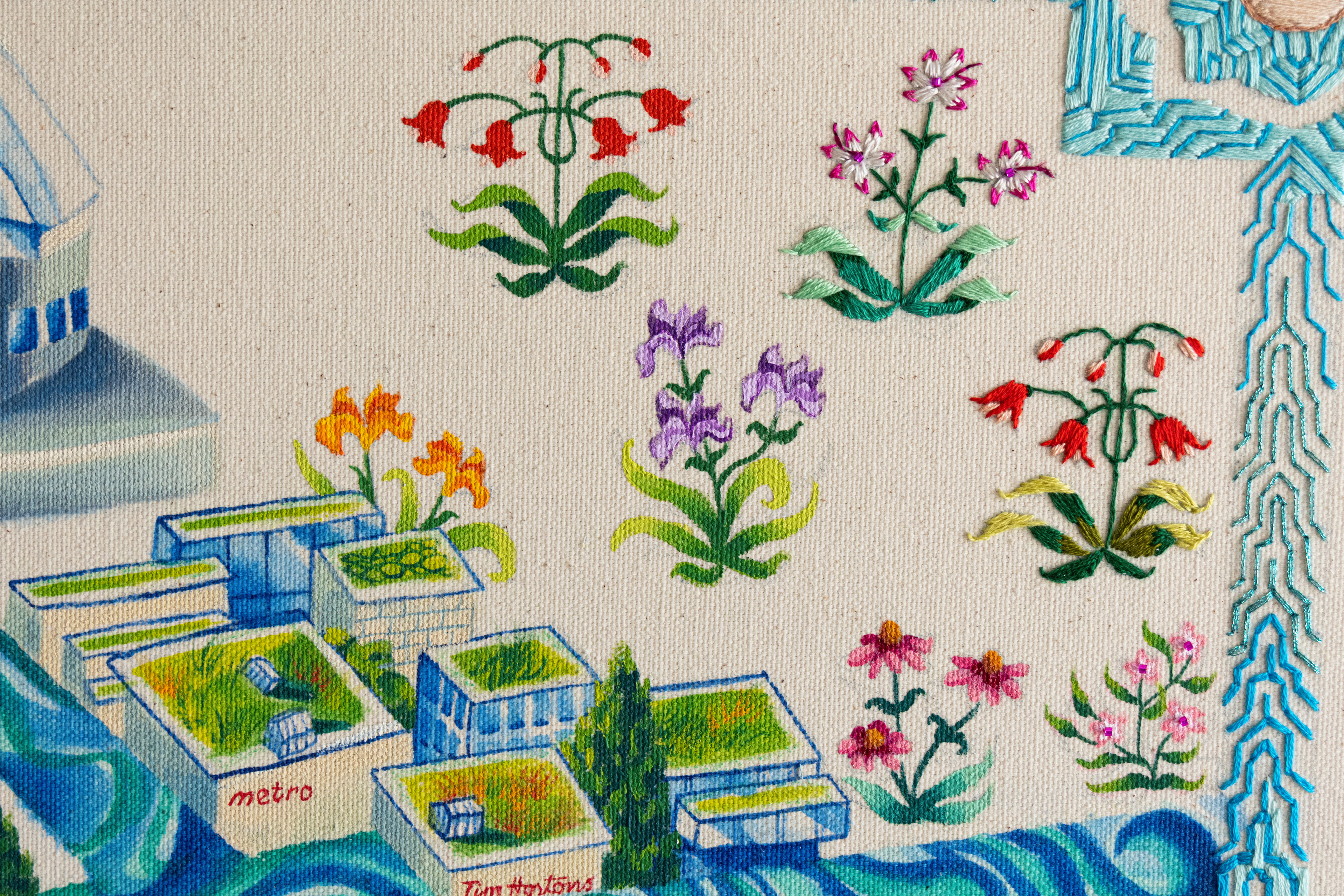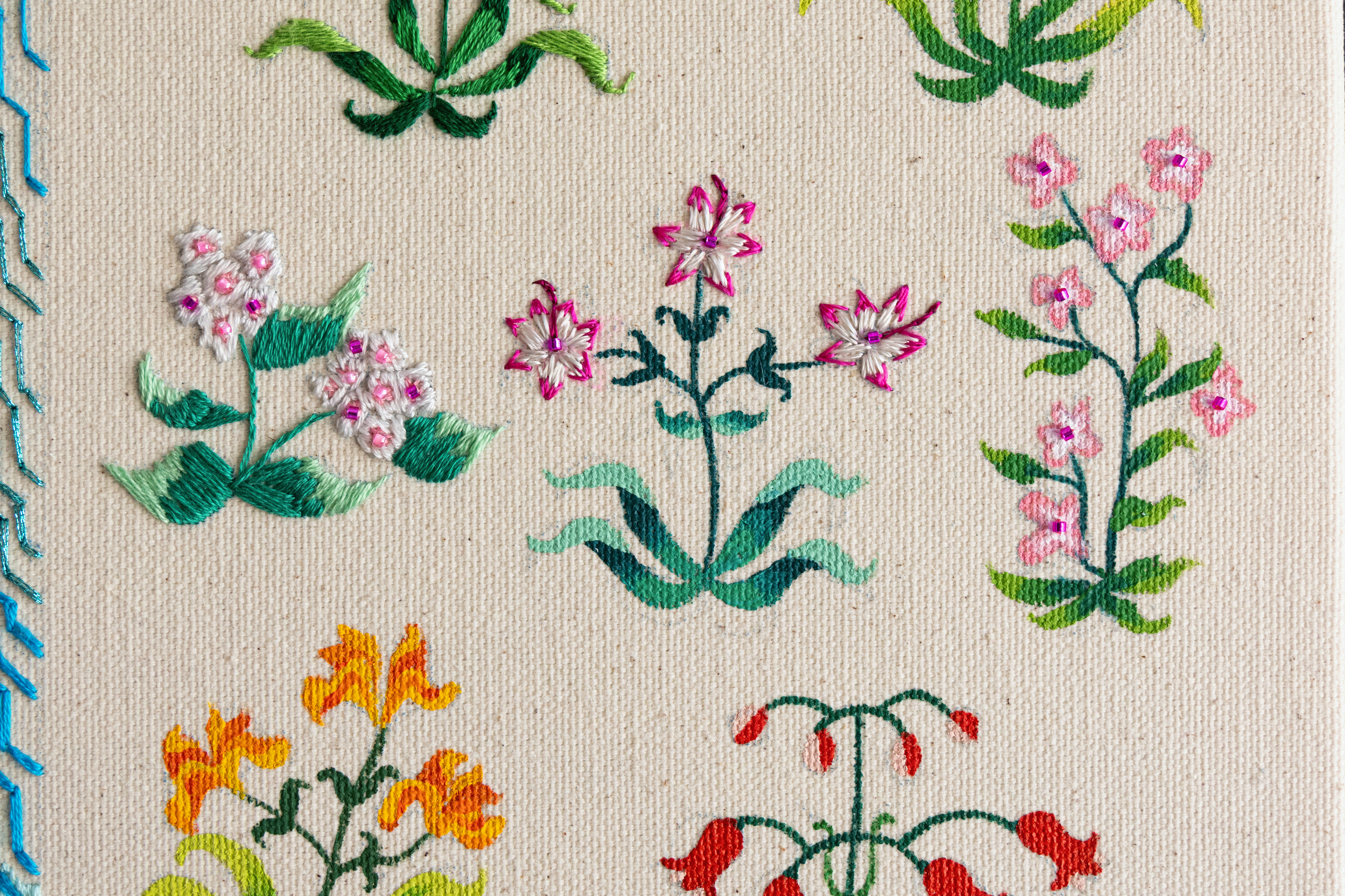 Ink, acrylic, fabric marker, embroidery and glass beads on canvas.